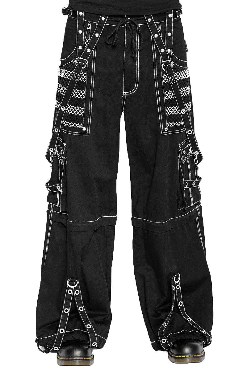Haunt their nightmares in these baggy black Tripp pants, possessed with ghostly-white details. Embrace your inner darkness in the metal hardware, removable chains, and deep netted pockets. Features adjustable ankles and a drawstring waist for the perfect fit. Zip off the pants legs to transform these Tripp pants into shorts!