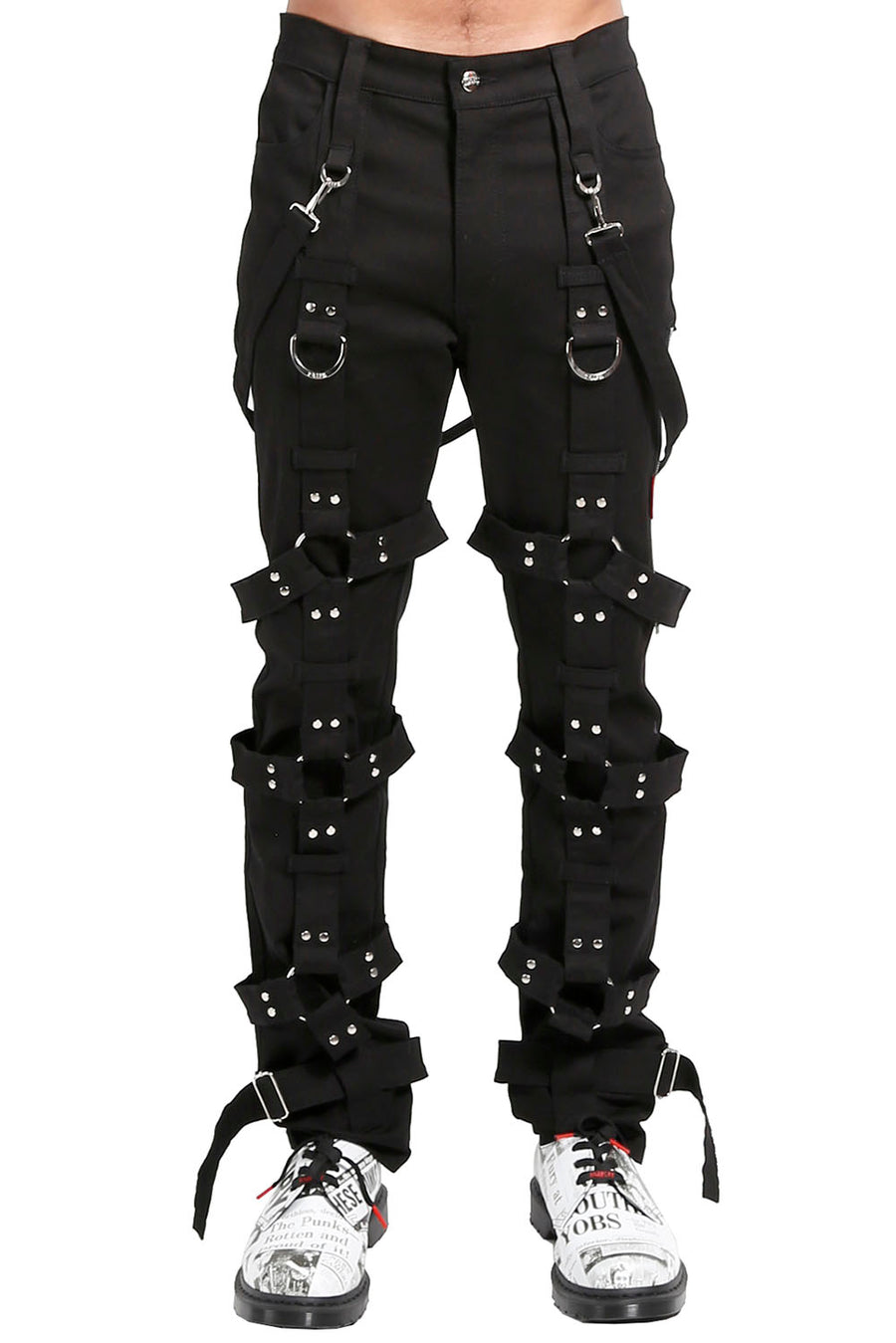 Yer caged and full of rage in these pitch-black Tripp pants! Complete with statement straps and metal hardware, you're a phantom menace in these bad** bondage pants! With 4 pockets and harnesses for dayz, you've got plenty of room to tote all her gear around next time you leave the crypt.