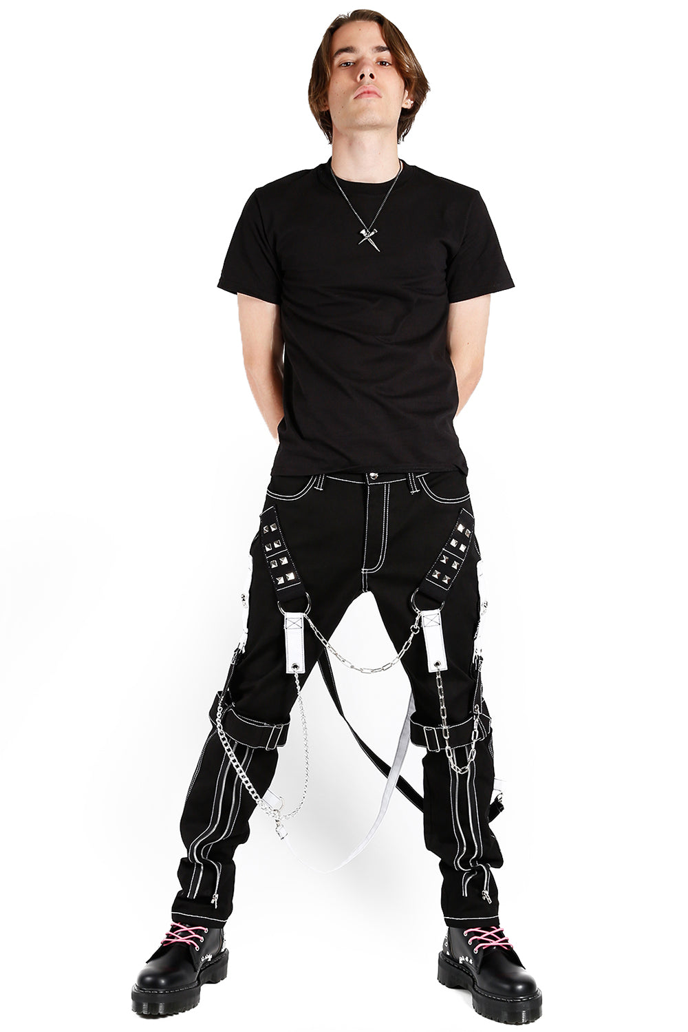 Make a statement in these black bondage pants, featurin' silver o-rings, metal chains, and pyramid cone studs. You're the ghost with the most in the wicked white contrast strips, bondage straps, and accent buckles around the knees. The pant legs can be zipped for a change in style, topped off with a zippered closure for a cool + comfy fit.
