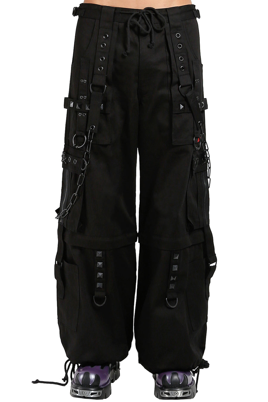 Make it rain chains in these hella hardcore baggy pants! Haunted with black metal hardware, these darkstreet pants are possessed with removable bondage straps, metal eyelets, and pyramid studs. Adjust the ankles for a change in fit—zip off the pant legs to turn these Tripp pants into shorts!