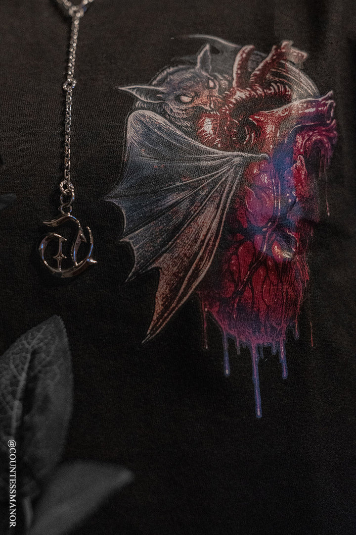 We handprint this blood-thirsty bat over your chest so it looks like a bat is biting your heart!