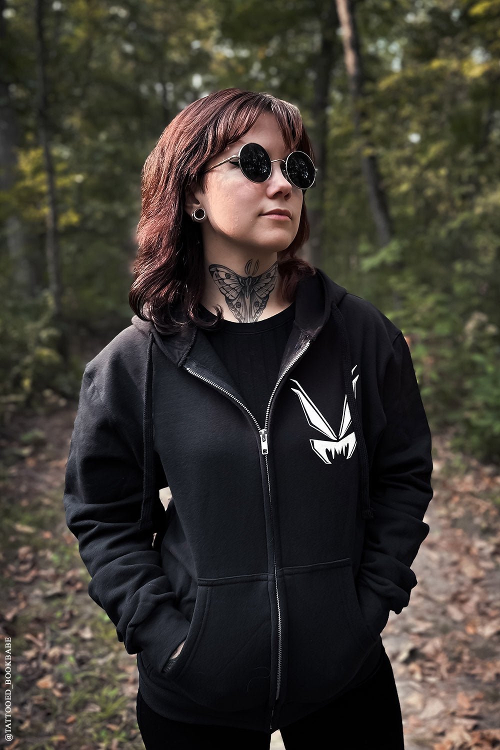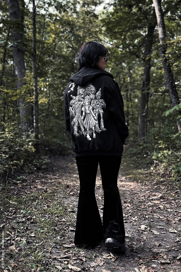 I love this hoodie. It fits perfectly and the image is large and beautifully printed. I like how the image extends into the pocket part of the hoodie, giving you a large and clear graphic. The image is the perfect blend of spooky and whimsical!