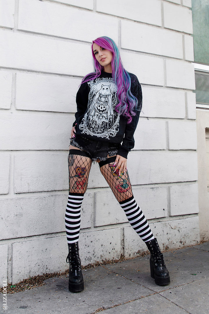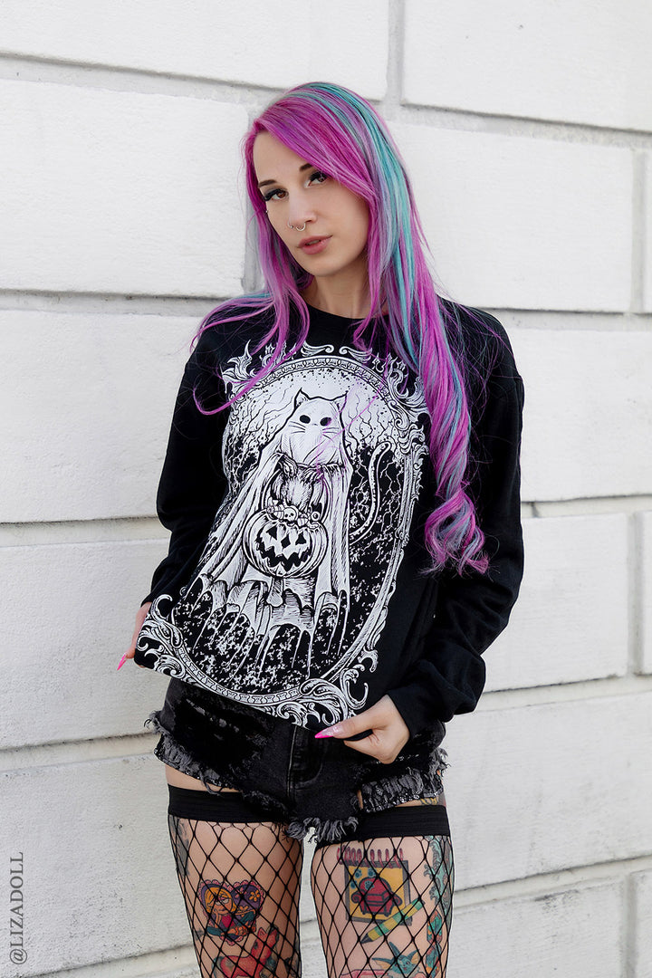 I love the sweatshirt so much because it reminds me of Halloween, and it pays homage to my kitty who passed last year. Thank you so much guys.