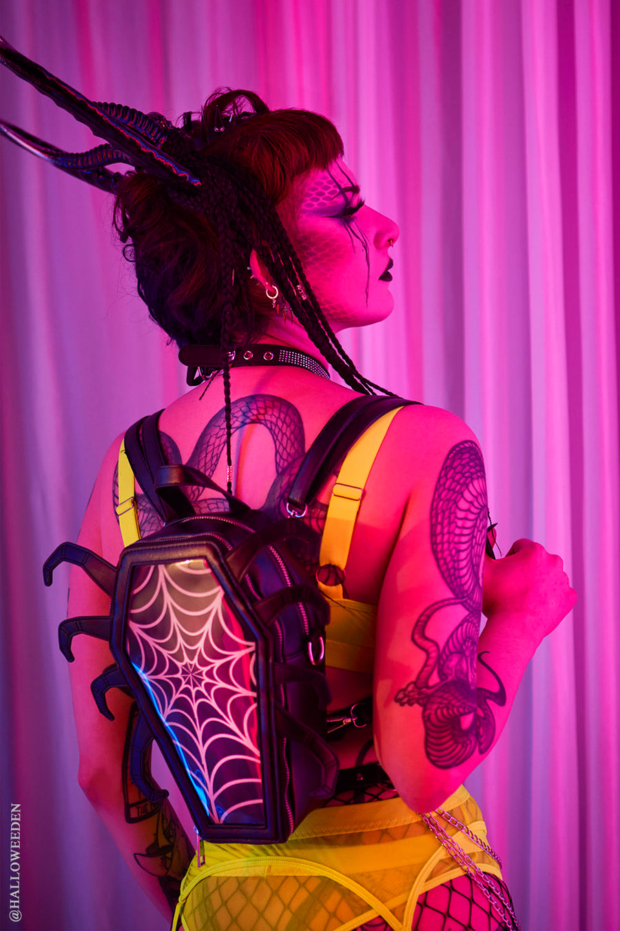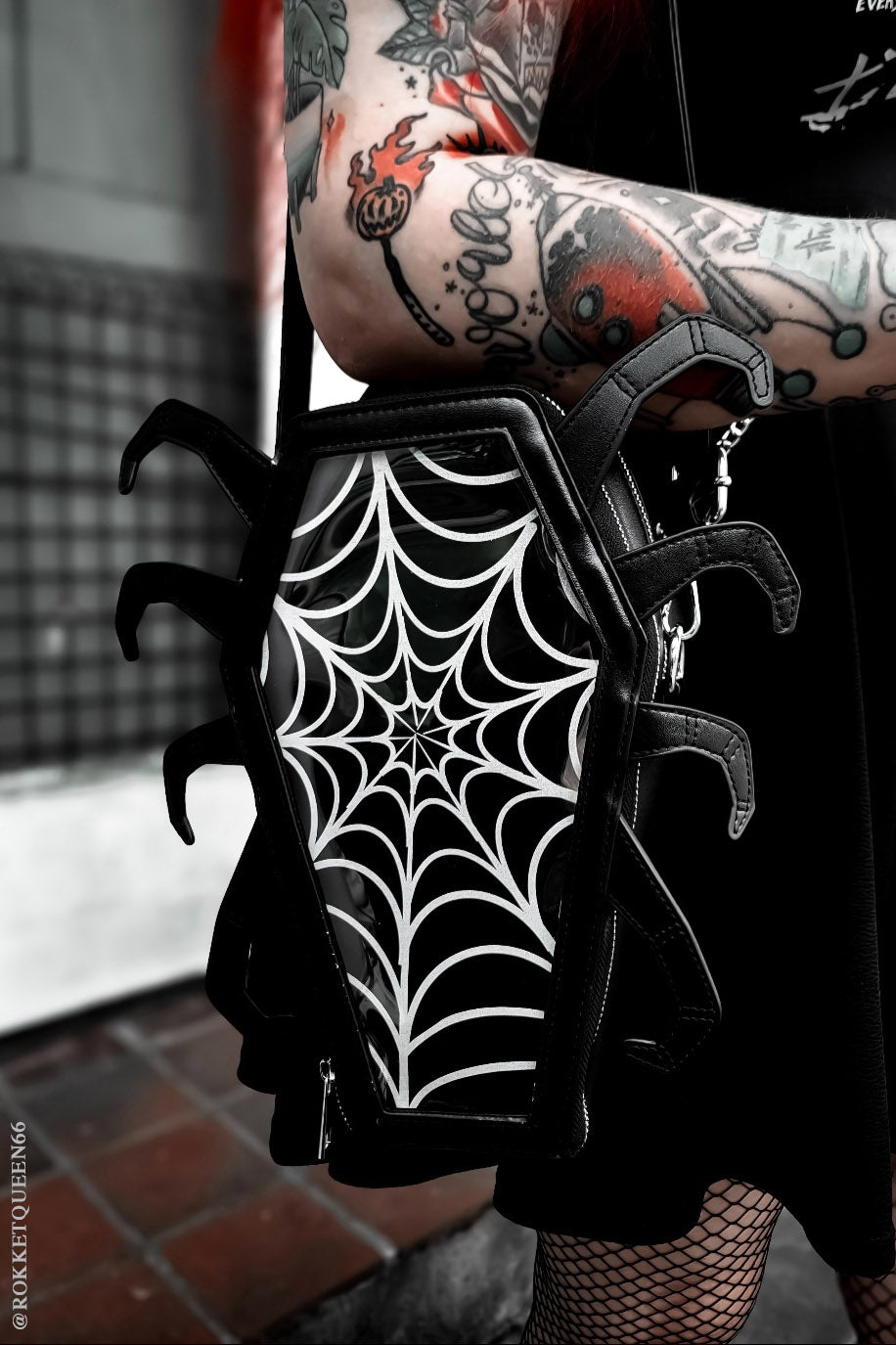 The Spider Coffin Ita Bag comes with 2 removable spiderweb inserts [choose White and Red or White and Purple]. Push your enamel pins through the spiderweb insert of your choice, then zip up the bag to put your spooky pins on display! If you're afraid of spiders (eek!), you can remove the web inserts for an all-black look.