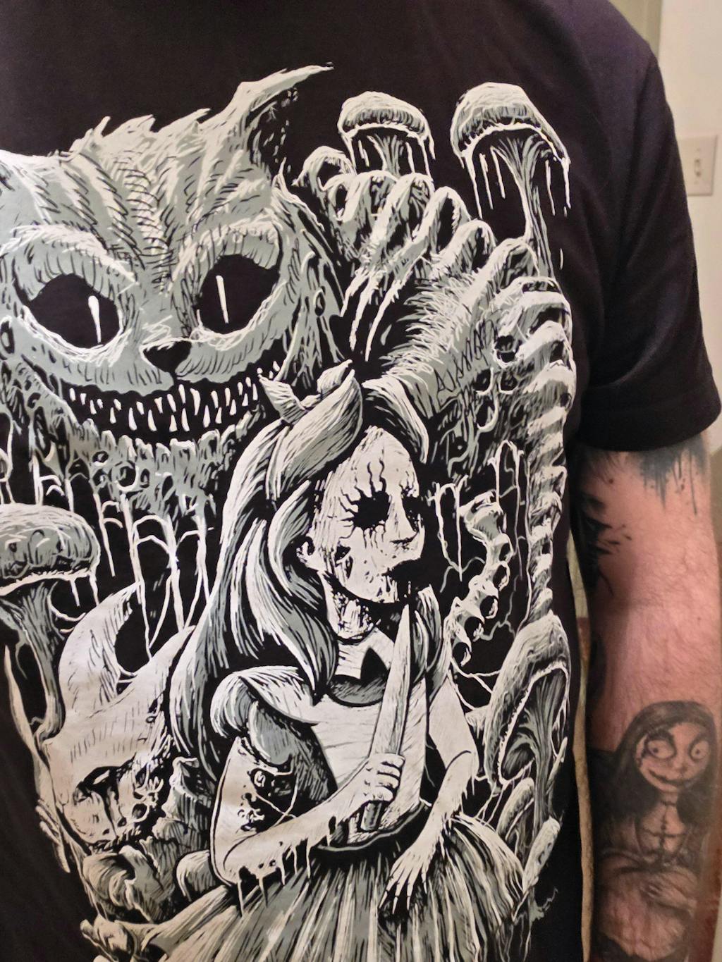 Morden Sie sich Ihren Weg ins Wunderland in diesem widerlichen T-Shirt! Fallen Sie im Heavy-Metal-Design in den Kaninchenbau, in dem Alice und das weiße Kaninchen mit Messern in der Hand das Wunderland heimsuchen. Über ihnen lauert die Grinsekatze – ihr gestreifter Schwanz besteht aus Wirbelsäulenknochen. Sündhaft weich, um Ihr böses, skurriles Herz zu erfreuen.