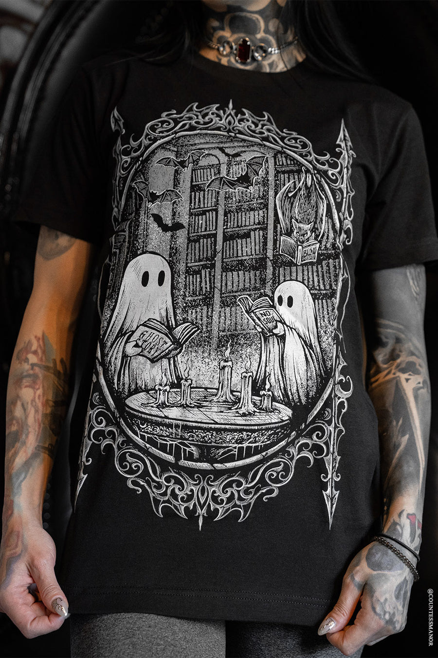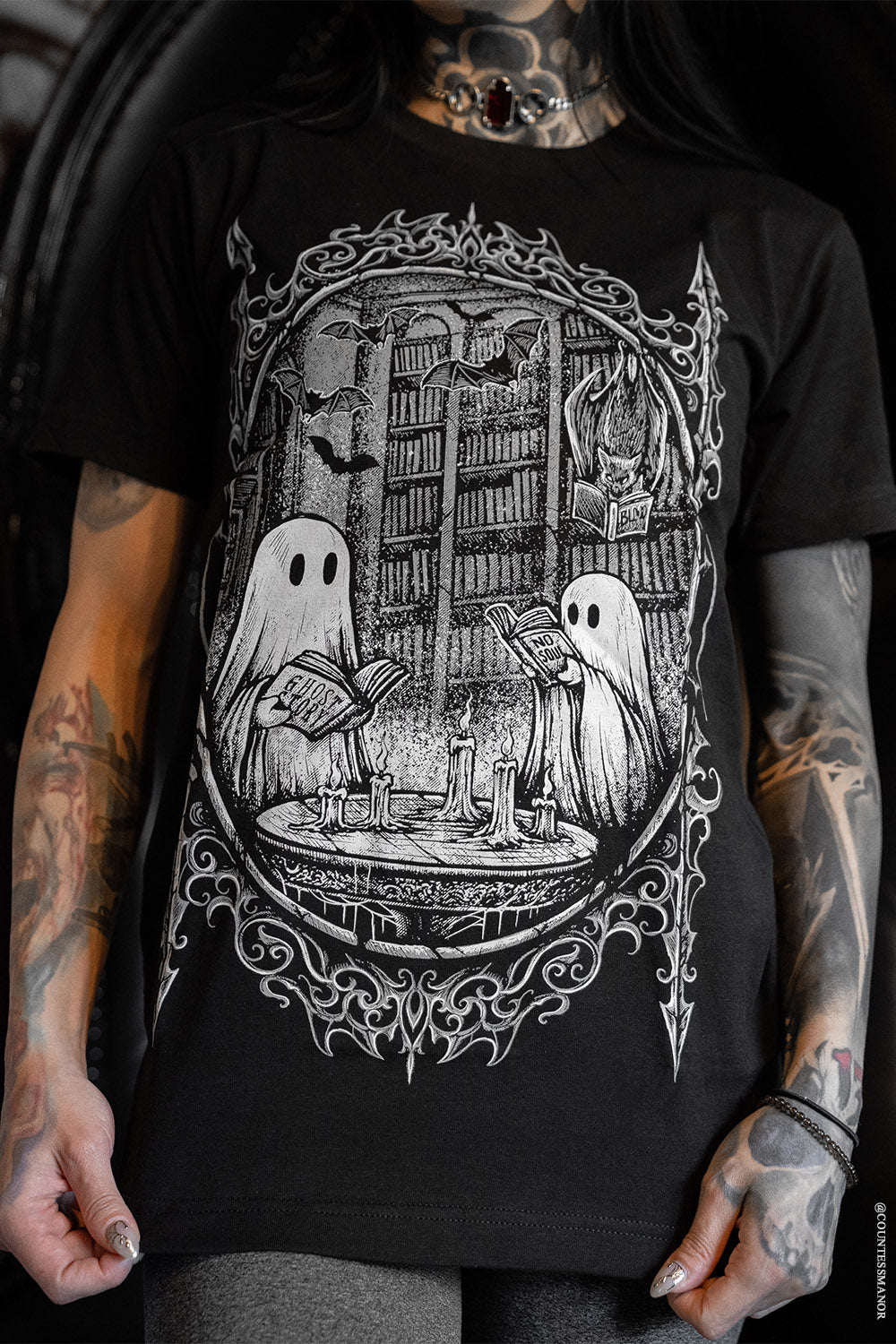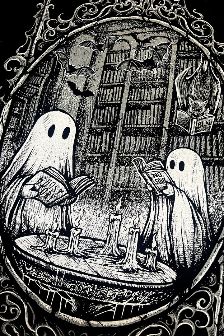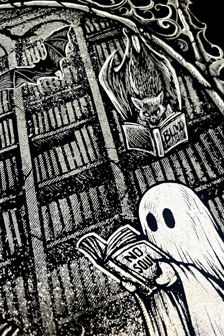 Love my Ghost Stories shirt. I get lots of compliments and comments on the word play. Also love the bat in the corner reading the book titled, Blood
