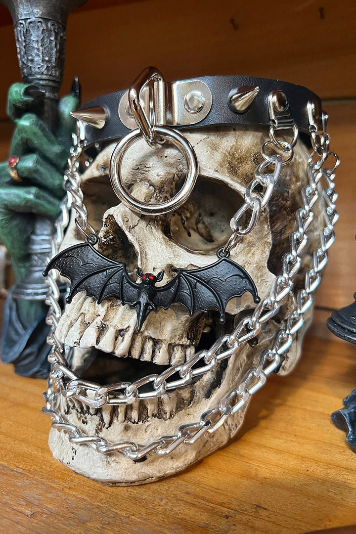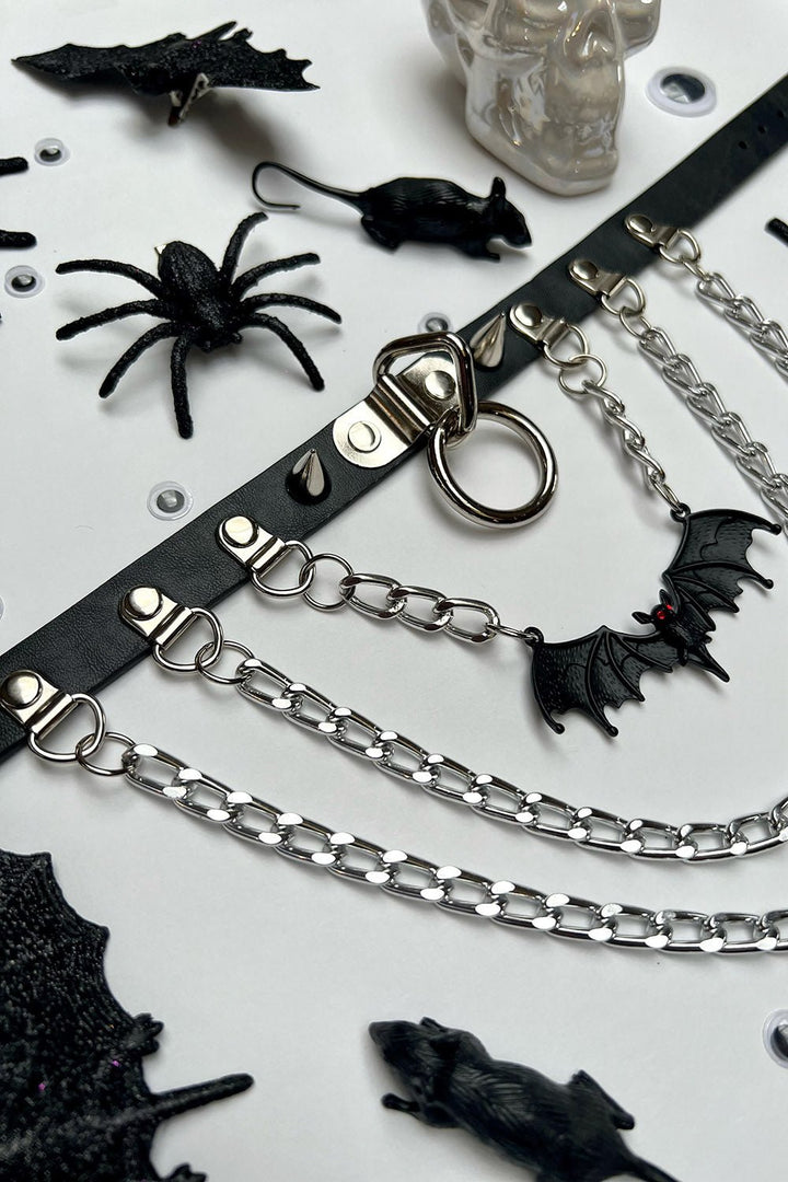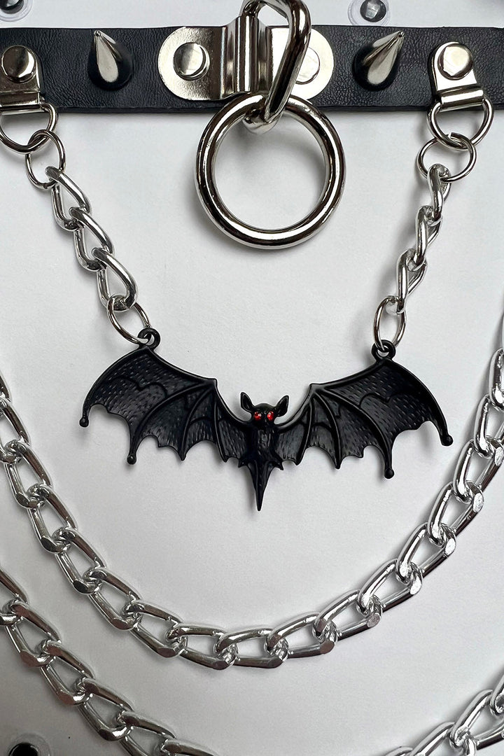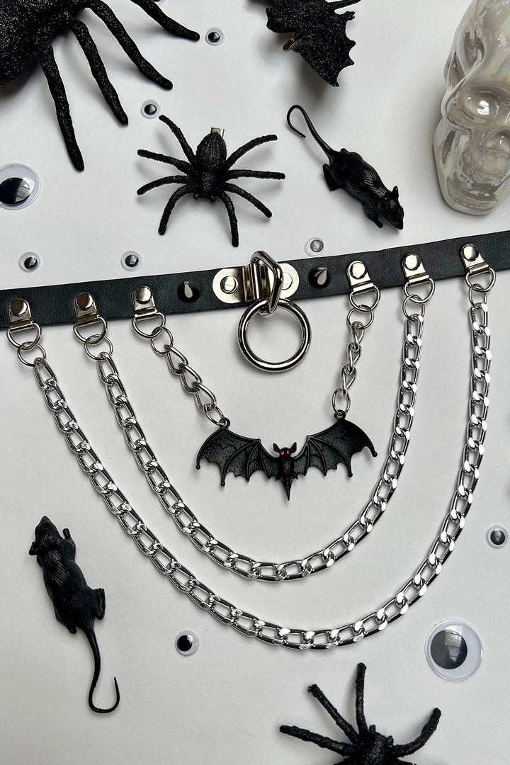 I love this choker so much more then i thought i would. the chains look so cool stacked (they're attacked in the back so you don;t have to worry about reconnecting them every time you put the collar on) and the bat is so big and cool. I get SO many compliments on this thing no joke.