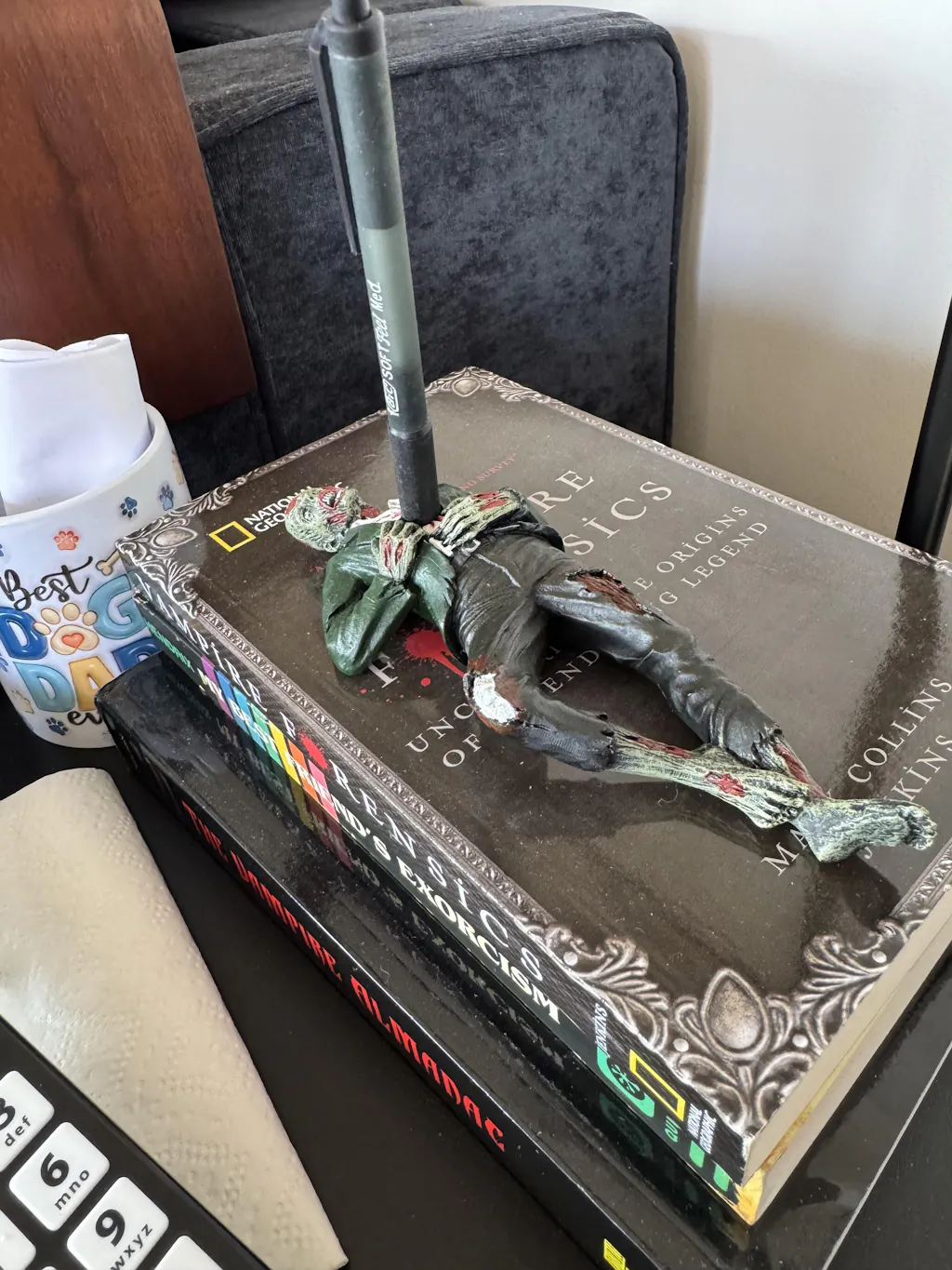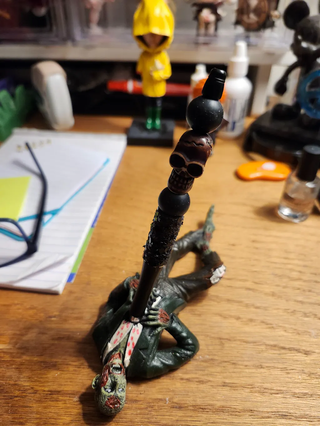 Summon screams to your stationary with this morbid pen holder! Never feel like a zombie at work again with this cadaverous figurine haunting your desk! Painstakingly hand-painted, this horrific pen holder features a zombie corpse pierced by a writing utensil. Gorrified with injury stains, scrapes, blood, and details of decay. Perfect for holding your pens, pencils, etc.