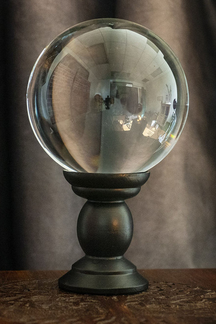 The witch's hands clutch the glowing crystal ball, summoning sprits from beyond the grave.