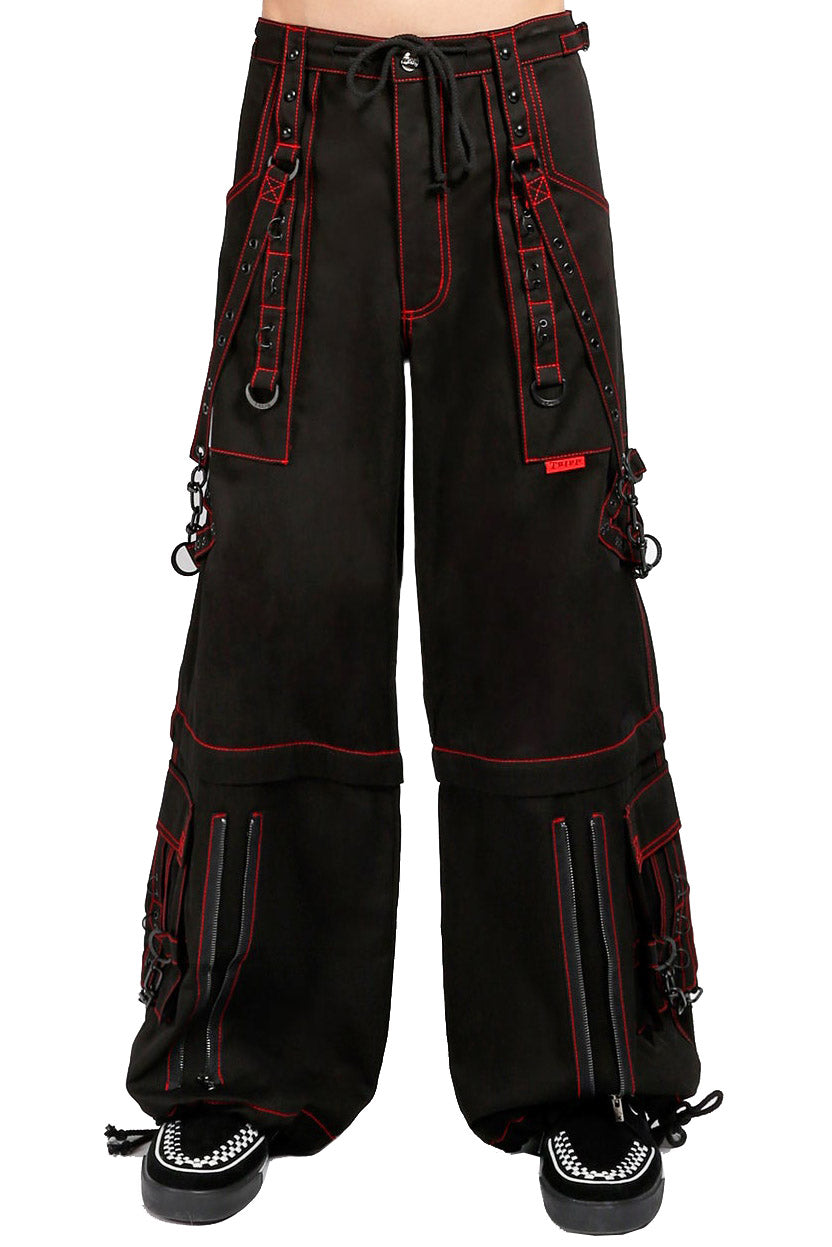 Darkness knows your name in these statement street goth pants—baggy, black, and haunted with blood-red contrast stitching! Invoke your inner vampire in the black metal hardware, featuring eyelets, pyramid studs, and punk piercings. Adjust the ankles & drawstring waistband till you're comfy and creepy—zip off the pant legs to transform these Tripp pants into shorts! Perfect for creatures of the night.
