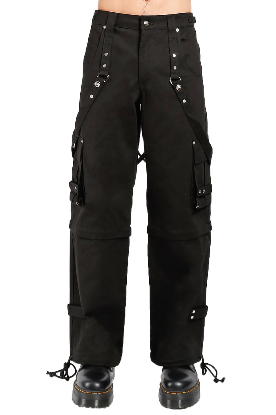 Crush it in these all-black street goth pants! Constructed for creeptures of the night, these baggy bondage pants feature metal studs and detachable straps. Features belt loops, zip fly, and button closure for the perfect punk fit. Tote your goth goodz in the deep pockets—zip off the pant legs to transform these Tripp pants into shorts!