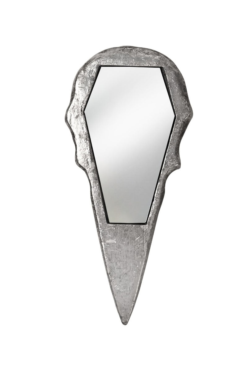 Invoke the visage of poets past with this gorgeous hand mirror! Constructed of quality resin, this gothic mirror is shaped like the raven of Edgar Allan Poe. With a haunting 3D shape, this ornate mirror features fissure details and a realistic skull design. Washed in an aged finish to make this haunting hand mirror look like a relic of old!