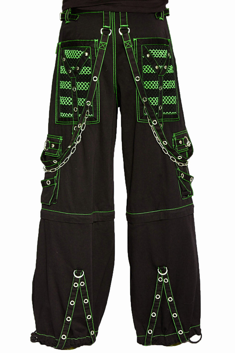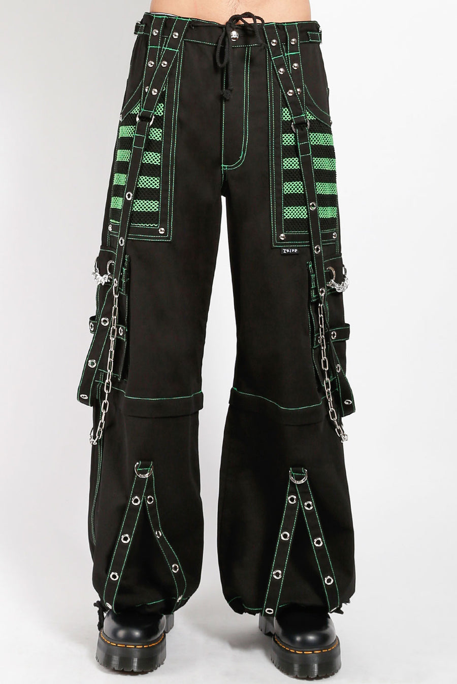 Summon electric feelz in these rad raver pants! Release hell in the bright green accents, silver eyelets, and metal D-ring hardware. Carry your smokes and wallet in the deep netted pockets—rock or remove the statement chains! Features adjustable ankles and a drawstring waist for the perfect fit. Zip off the pants legs to transform these Tripp pants into shorts!