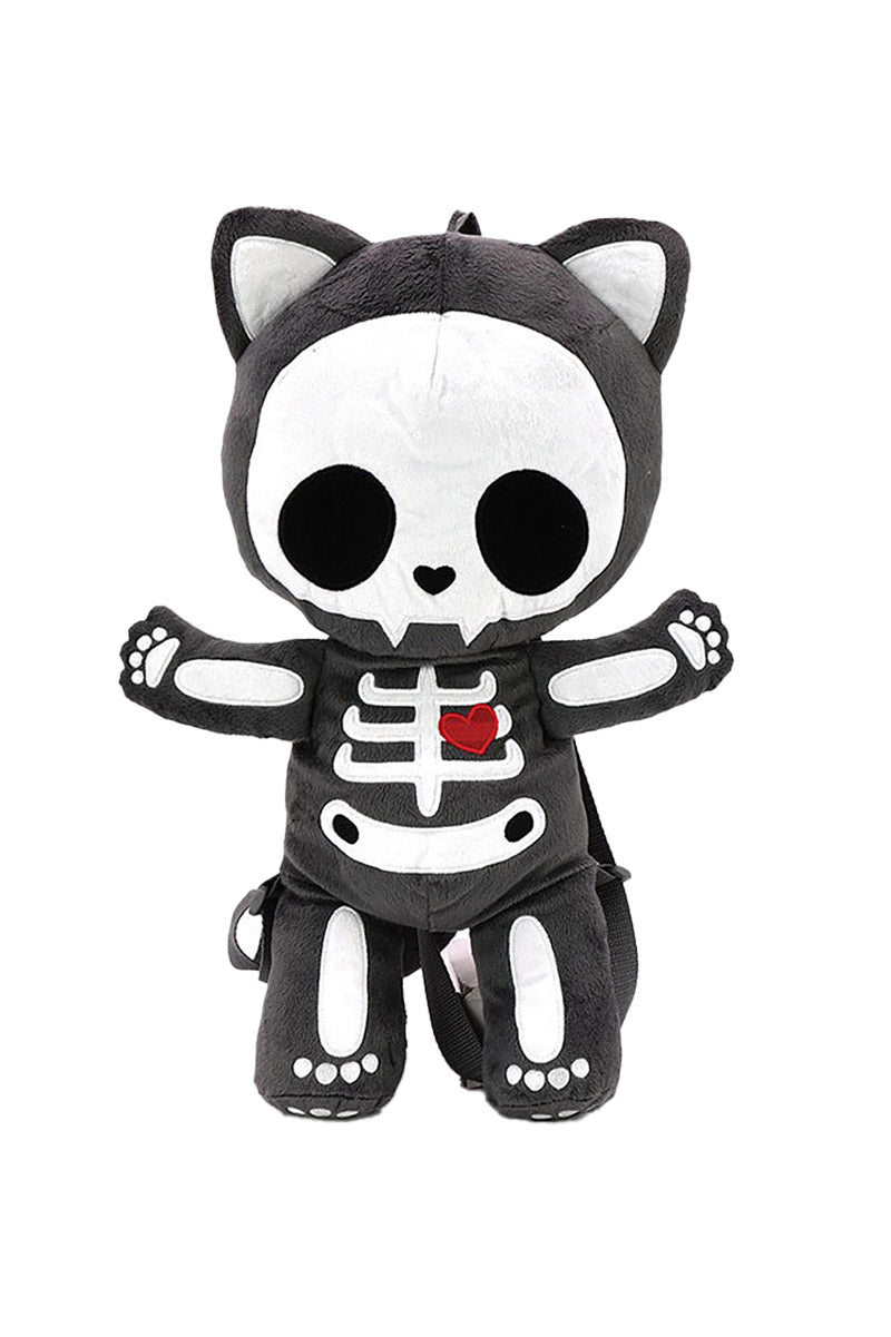 emo Black and white skeleton cat plush toy backpack with a red heart on a white background