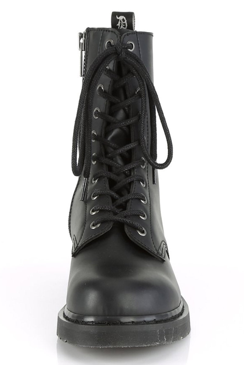 Sumérgete en la oscuridad del atardecer con estas botas Demonia oscuras y letales. Tu caos es un arma con los herrajes de ojal de metal negro, el tacón plano apilado y la lengüeta trasera. Déjate llevar por el estilo de combate hasta la mitad de la pantorrilla, el cierre de cremallera interior con detalles de cordones y la plataforma de 1 1/4 pulgadas. Fabricadas con cuero vegano negro de calidad porque has matado lo suficiente para toda la vida.