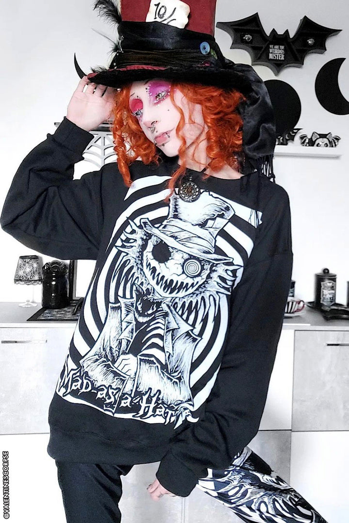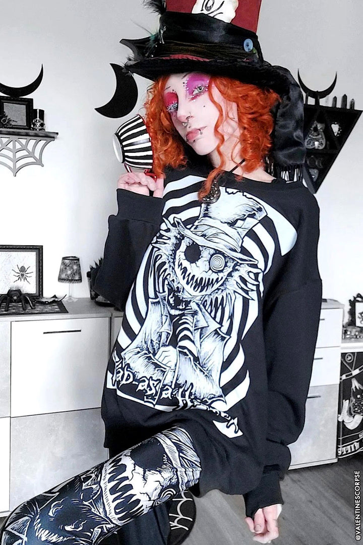¡Cae por la madriguera del conejo con esta sudadera tan extravagante y perversa! Sumérgete en la locura con este diseño escalofriante que presenta al Sombrerero Loco sosteniendo a su peculiar mascota... ¡el Gato de Cheshire! Un sombrero de copa desgastado reposa sobre la mata de pelo del Sombrerero. Con una extraña sonrisa aguda, vigila el País de las Maravillas con una espiral y un ojo negro cavernoso. Las letras Mad as a Hatter rondan el fondo en espiral para ayudarte a sumergirte en la locura. ¡La sudadera perfecta para hombres locos, padres de gatos espeluznantes y fanáticos de Alicia en el País de las Maravillas!