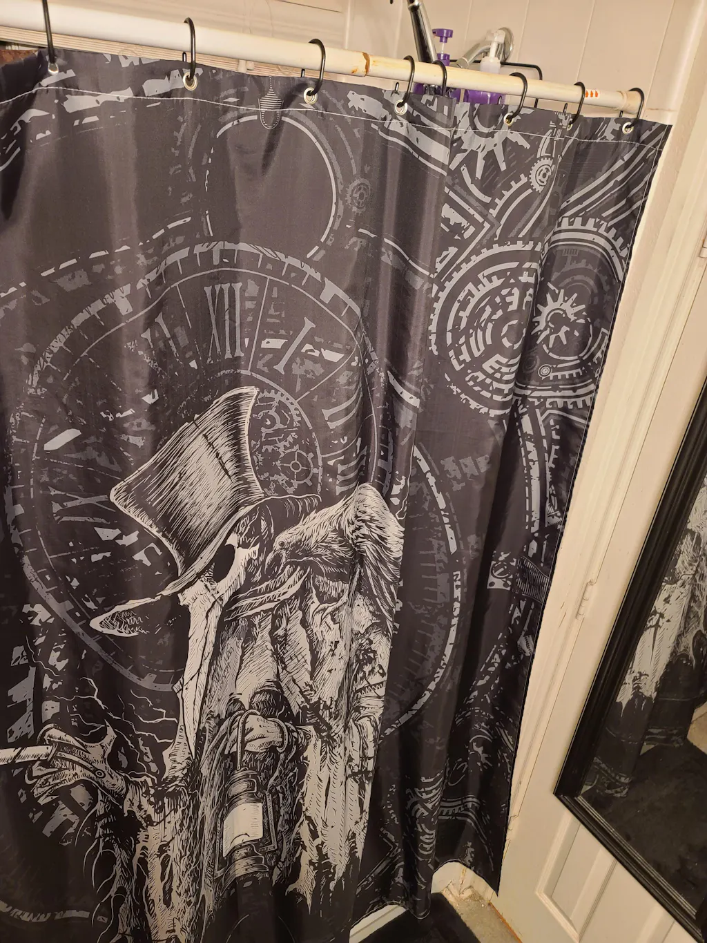 Decorate your bathroom with death! Bring some gallows humor to your bathtime with the Plague Doctor, holding a diseased syringe in his taloned hand. A raven on his shoulder to symbolize death—a macabre clock because Doctor Death knows your dying day. Summon scares to your shower with the high-quality image and quality construct, designed to be used as a shower curtain or photo backdrop. Includes metal grommets and black hoops for hanging!