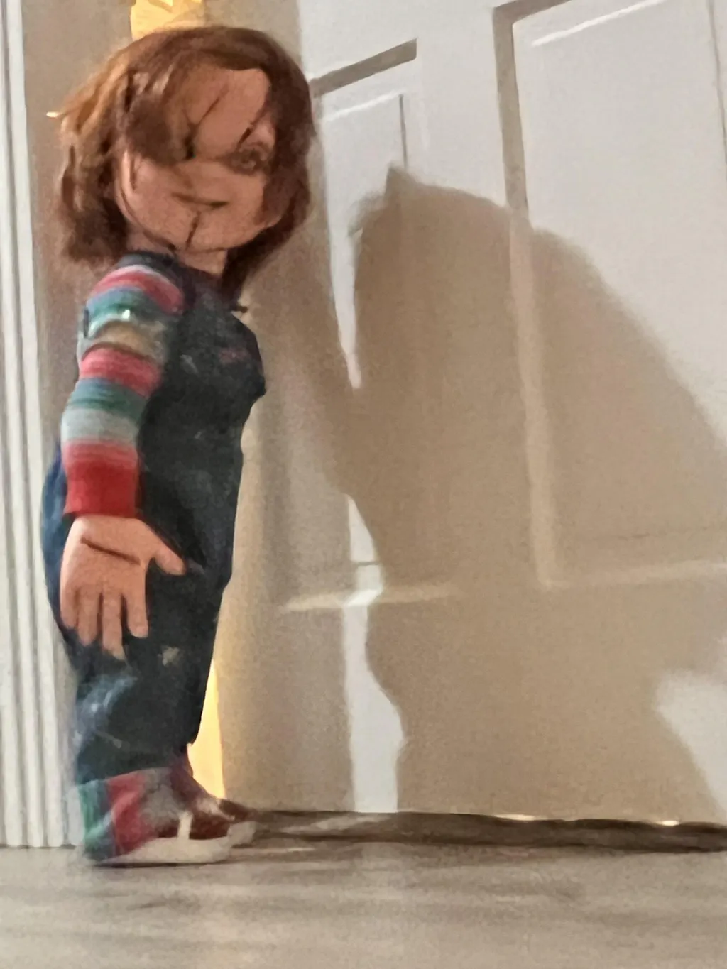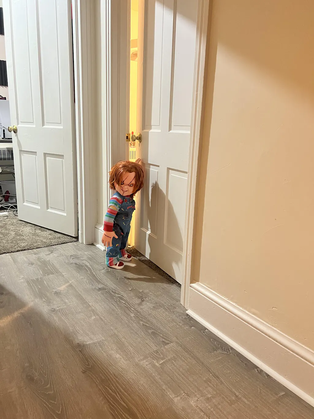 Haunt your house with the living dead doll of your nightmares! Officially licensed by Universal Studios, this horror movie prop is HUGE! Painstakingly hand-sculpted, this killer doll is made to look just like Chucky down to the most minute detail. Position him to your dark heart’s desire with the soft flexible foam body and industrial-strength posable aluminum frame. Rest him on your couch to give visitors a scare, or pop him on your bed to frighten the living hell outta your partner!