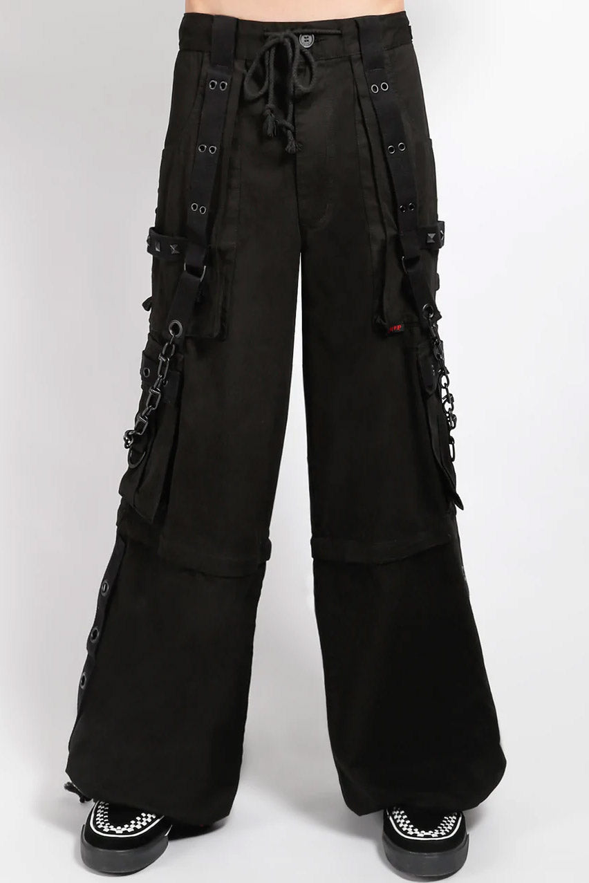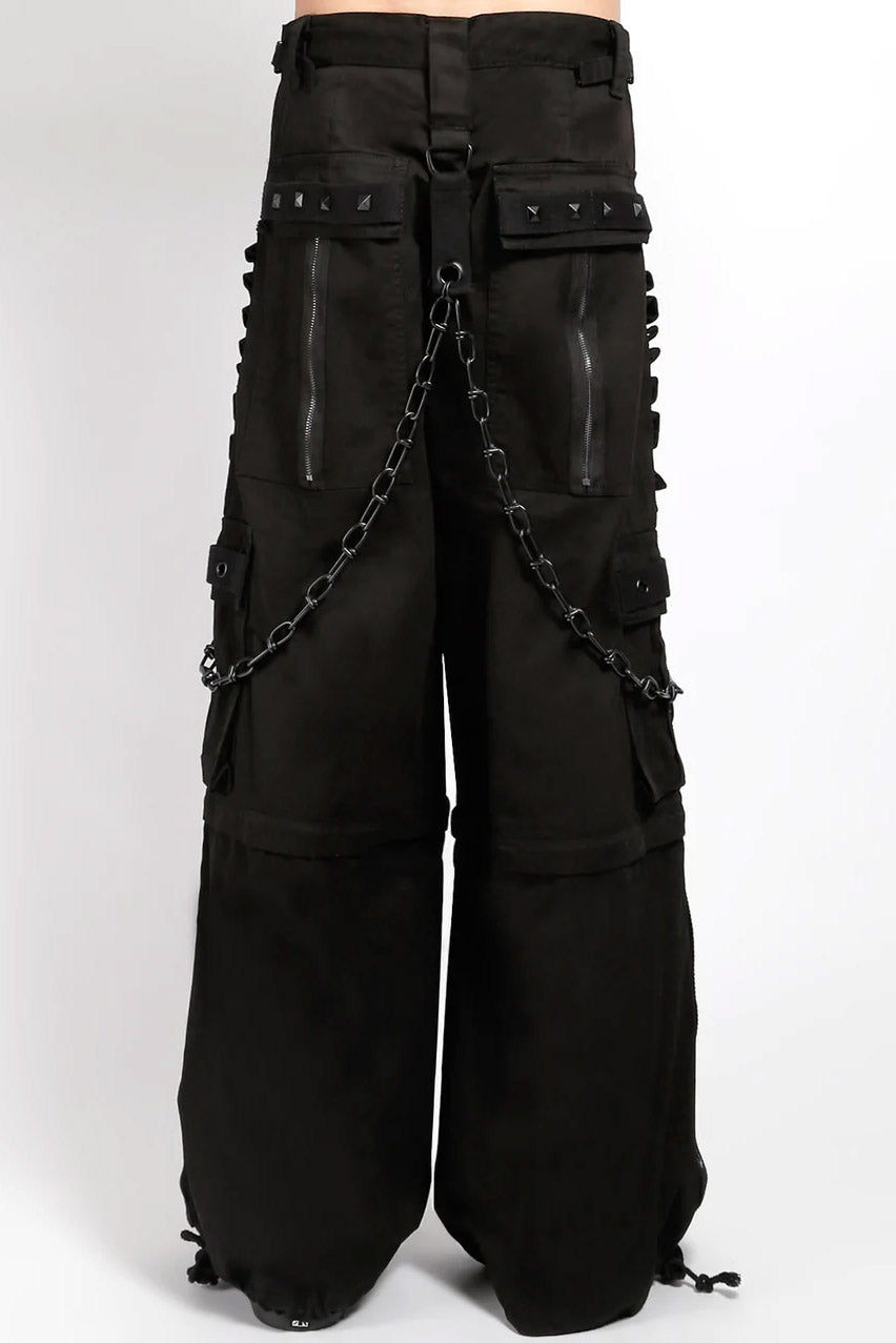 Escape the concrete jungle in these killer all-black pants! Spiked with metal pyramid studs, these street goth pants feature removable chains, bondage straps, and black metal eyelets. Tote you evil essentials in the deep pockets—zip off the bottoms to transform these Tripp pants into shorts!
