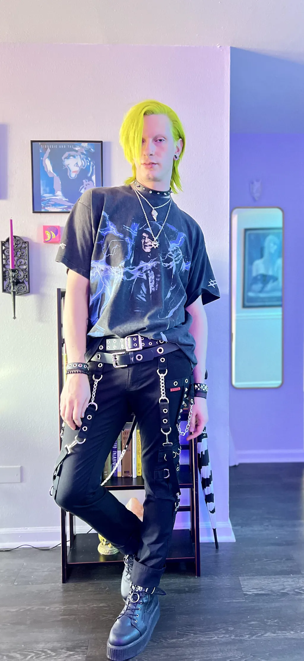 Make no excuses in these statement street goth pants, haunted with metal hardware. Kick it in the silver eyelets, metal piercings, pyramid studs, and silver chains. Punk-up your afterlife in the straight leg fit, black stitching, and detachable bondage straps.