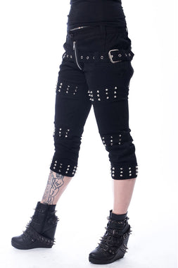 Harness the power of the night in these killer capris! Darkness knows your name in the silver rivet spikes, statement zippers, and all-over accent straps. Complete with a metal eyelet grommet belt cause you're metal AF.
